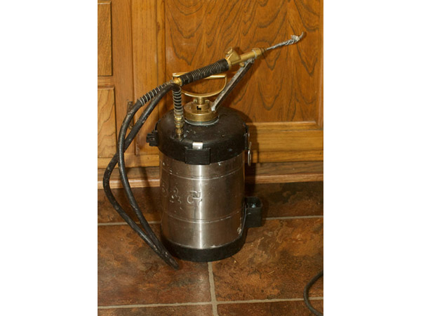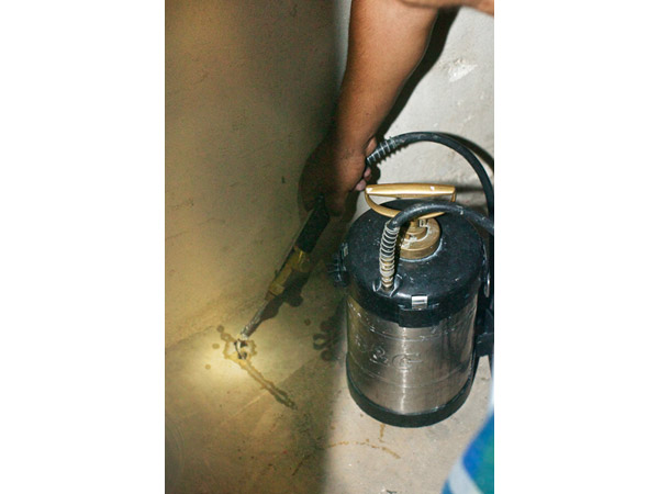After holes are drilled through the concrete, termiticide is used to treat subterranean termites.